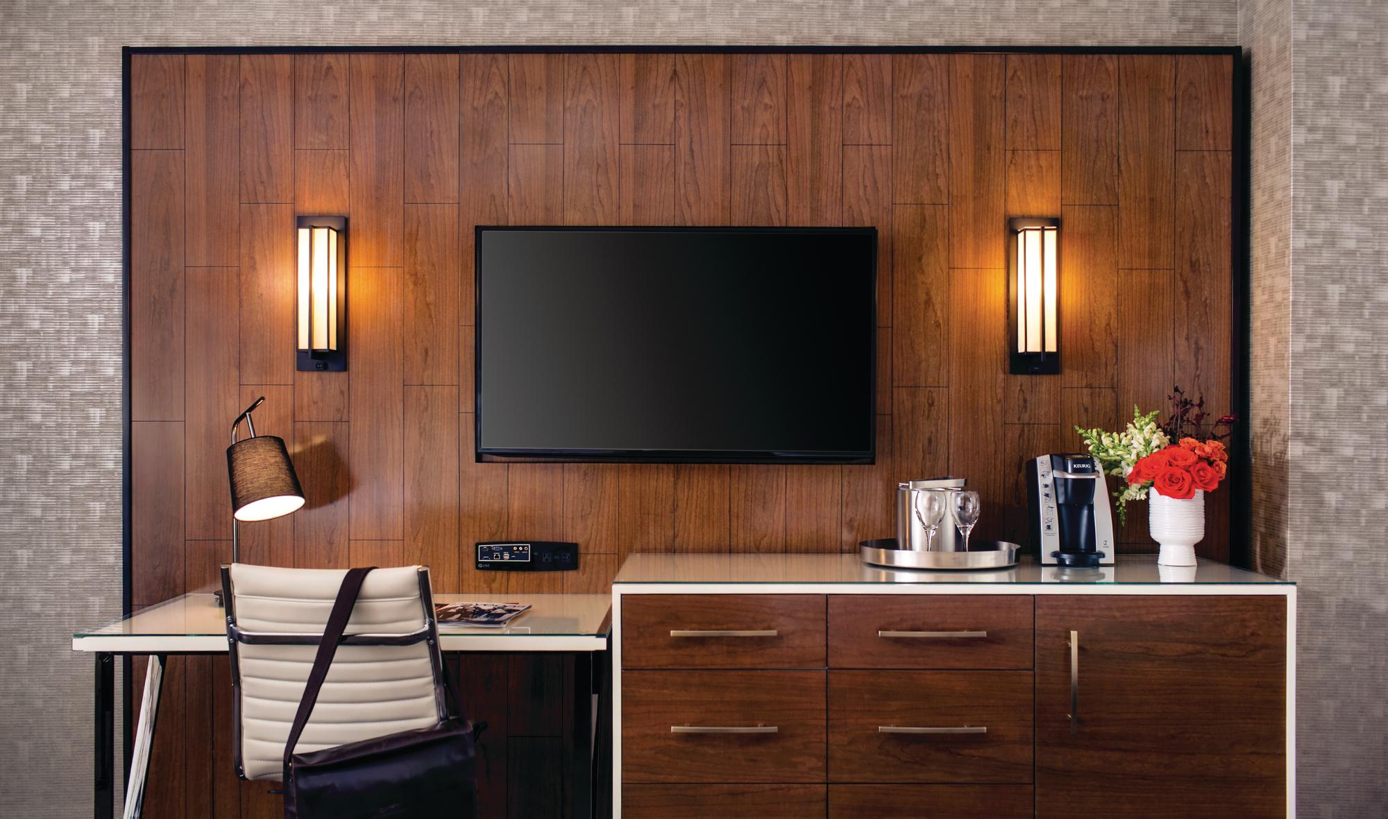 - Desk area with TV media hub including multiple charging and connection outlets