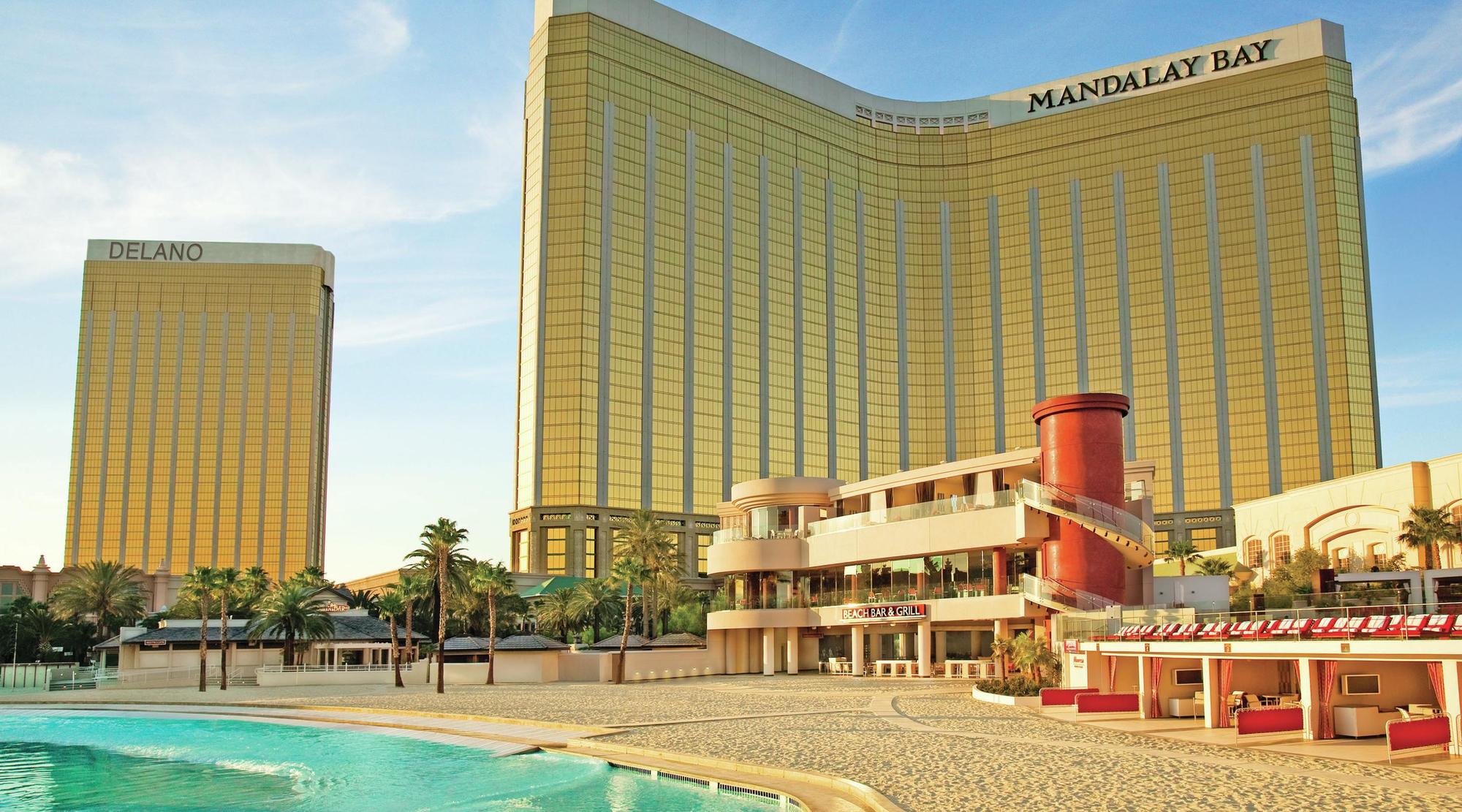 Take escalators or guest elevators down to the beach level. Exit doors to the Beach Path. Enter Mandalay Bay Beach via main entrance and the Beach Bar and Grill will be on the left.