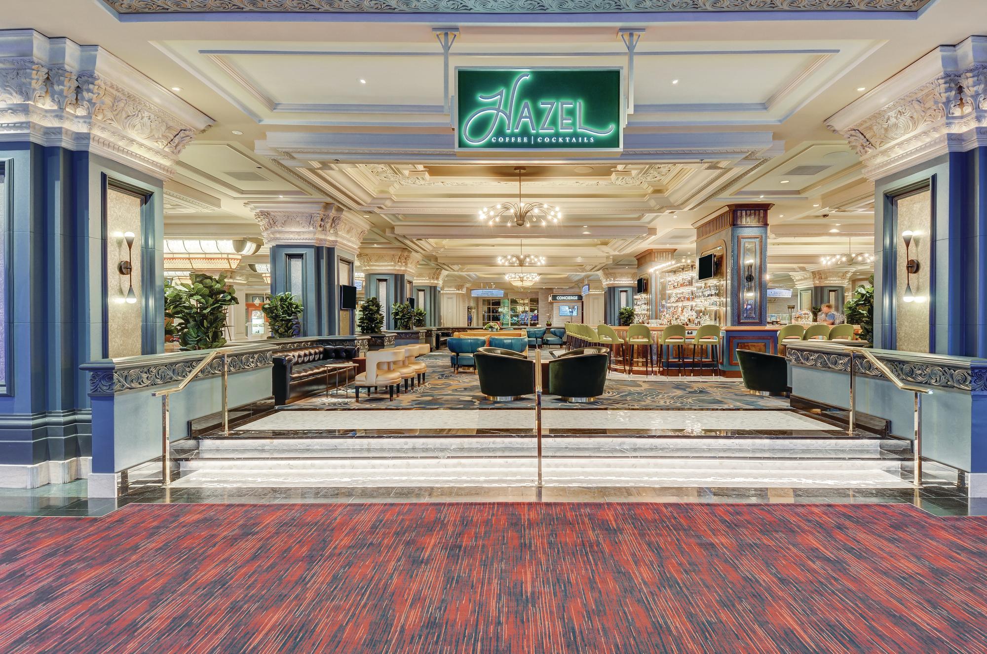 Enter the doorways from the garage area and follow pathway as it veers to the right. Take left onto casino floor. Hazel will be on the left-hand side.