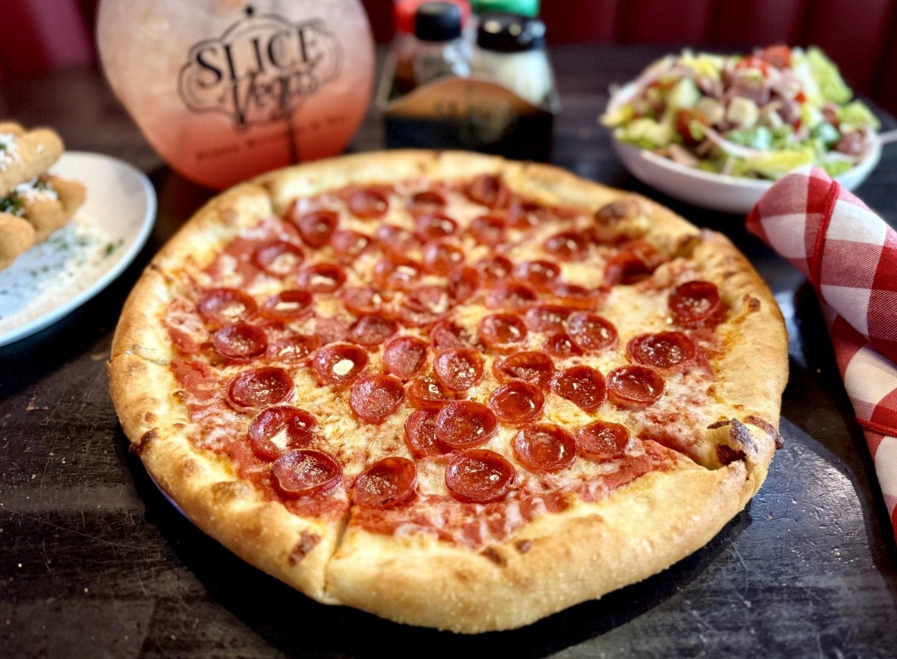 Slice of Vegas serves handmade Brooklyn-style pizza, fresh Italian dishes with bold flavors, unique salads, and a variety of sandwiches. For those with specific dietary needs, Slice of Vegas offers gluten-free pizza and pasta options, as well as vegetarian and vegan options. There is a full bar with an extensive selection of craft beers, a variety of wines, and signature drinks. Come in and enjoy the relaxed, laid-back atmosphere while watching your favorite teams on any one of the 15 HD TVs or 8-foot HD projection screen. In a hurry? Stop by the Deli Counter for a quick slice when you’re on the run, or order from the whole menu for a convenient option on the go.